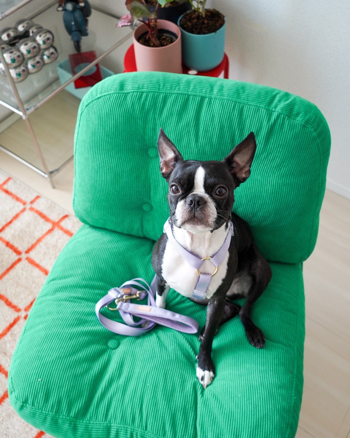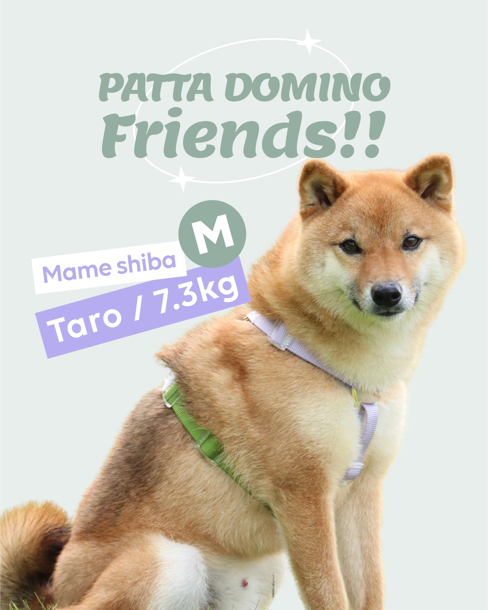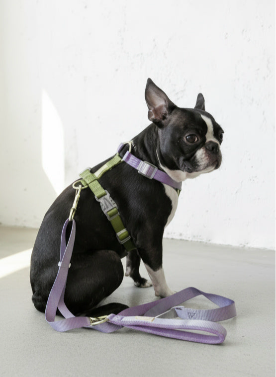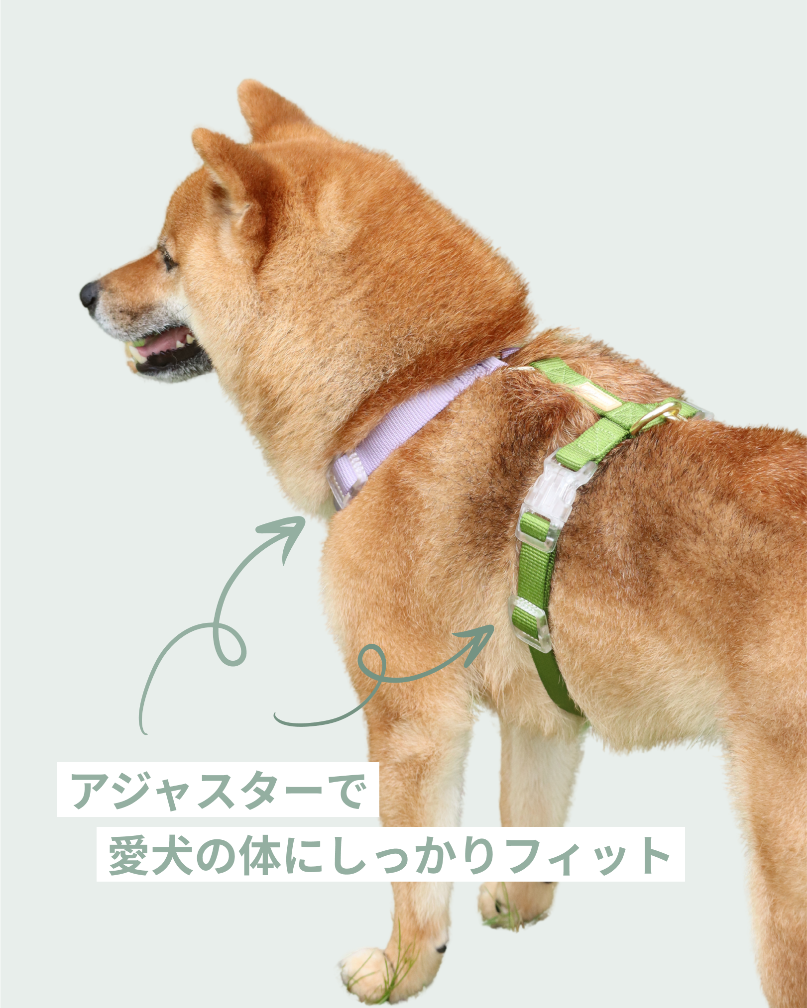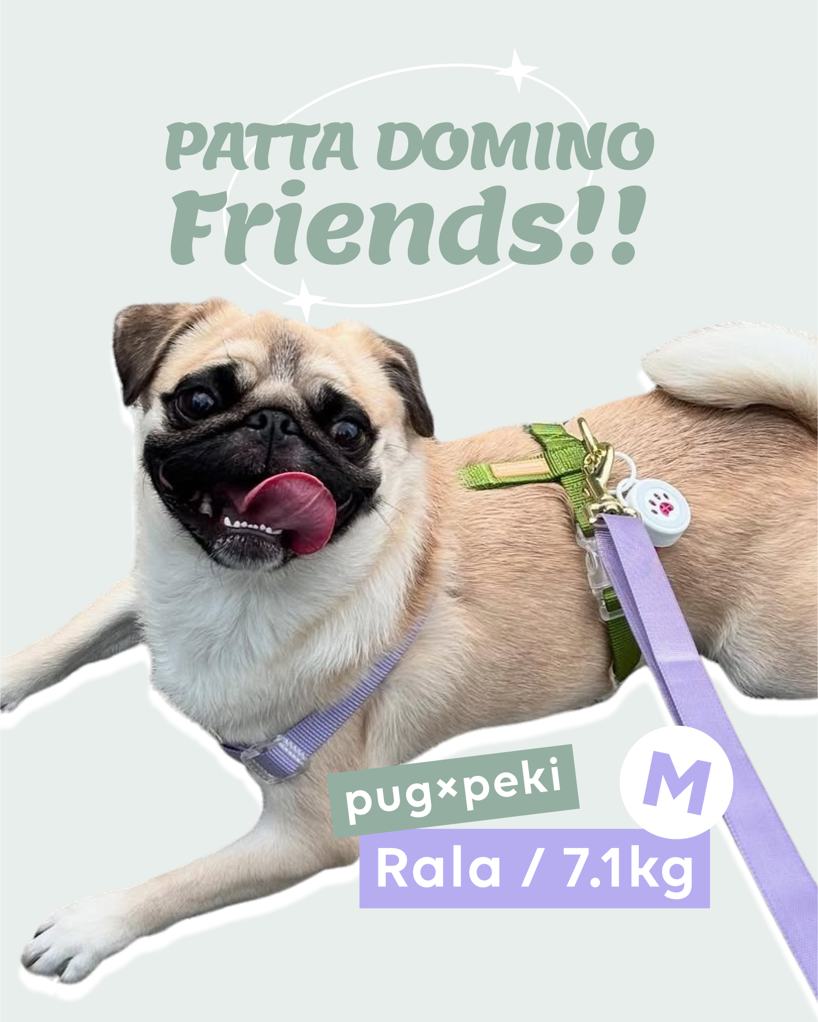 PATTA DOMINOのオリジナルハーネス。ストラップでサイズ調節でワンちゃんの体にぴったりフィット。引っ張った際の圧力が均等に分散されるため体に優しい仕様になっています。