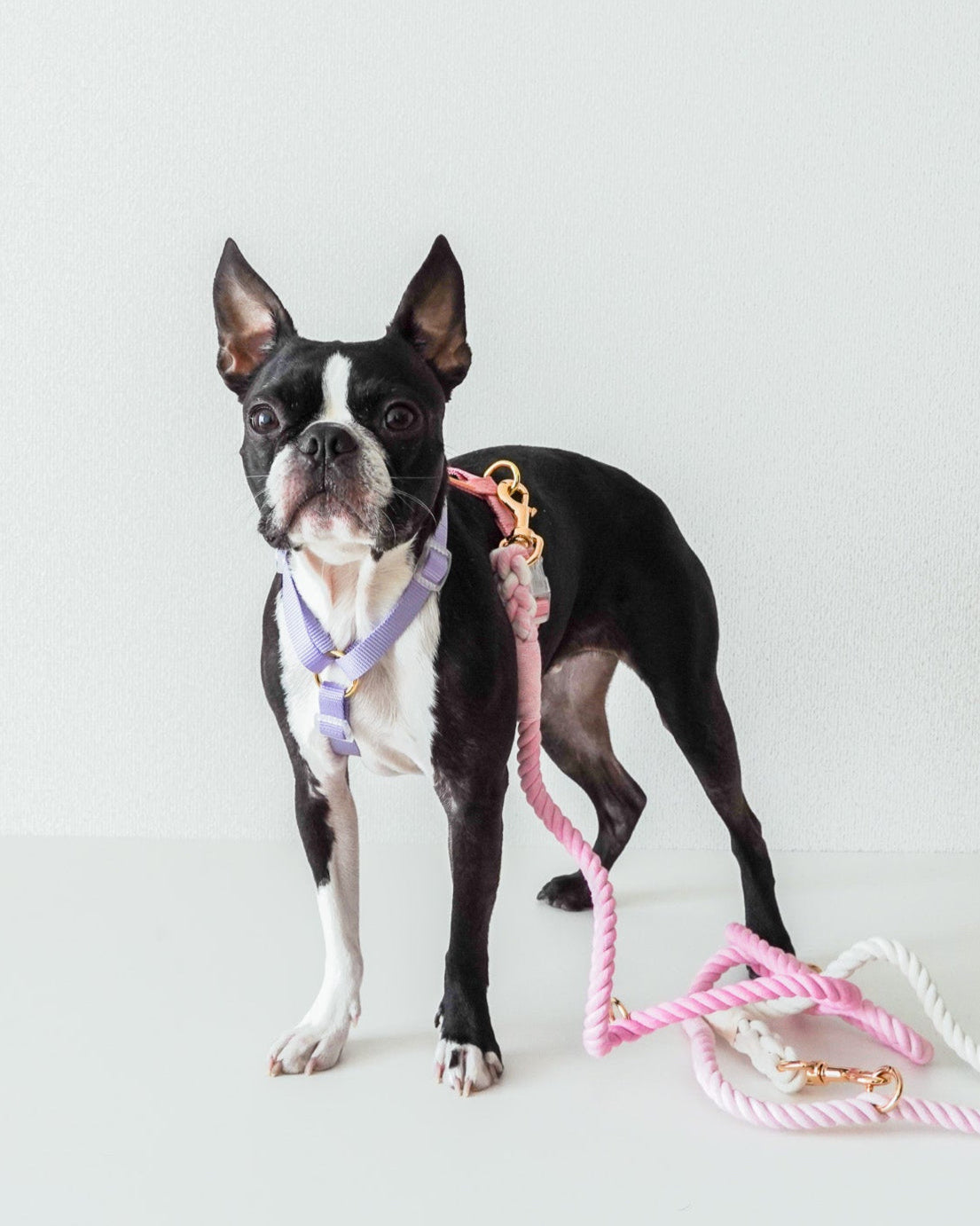 PATTA DOMINOのオリジナルハーネス。ストラップでサイズ調節でワンちゃんの体にぴったりフィット。引っ張った際の圧力が均等に分散されるため体に優しい仕様になっています。
