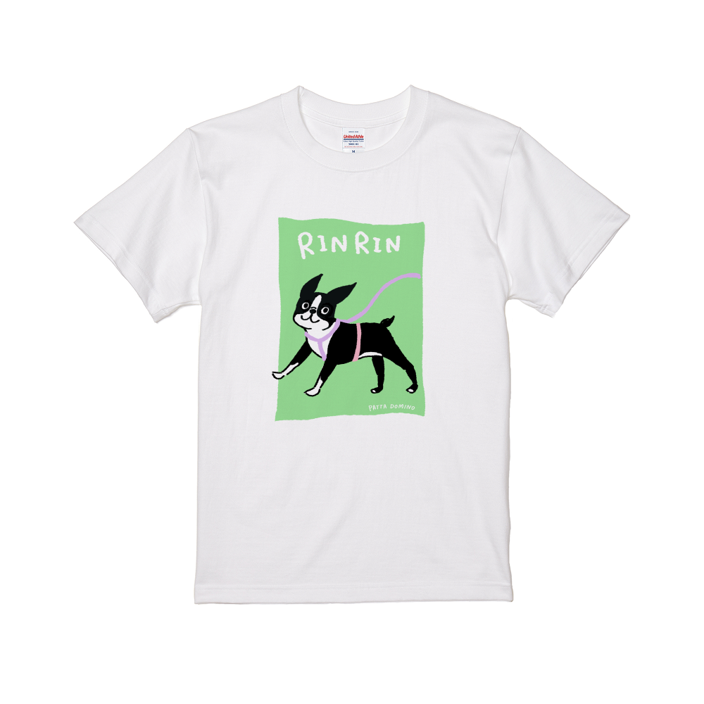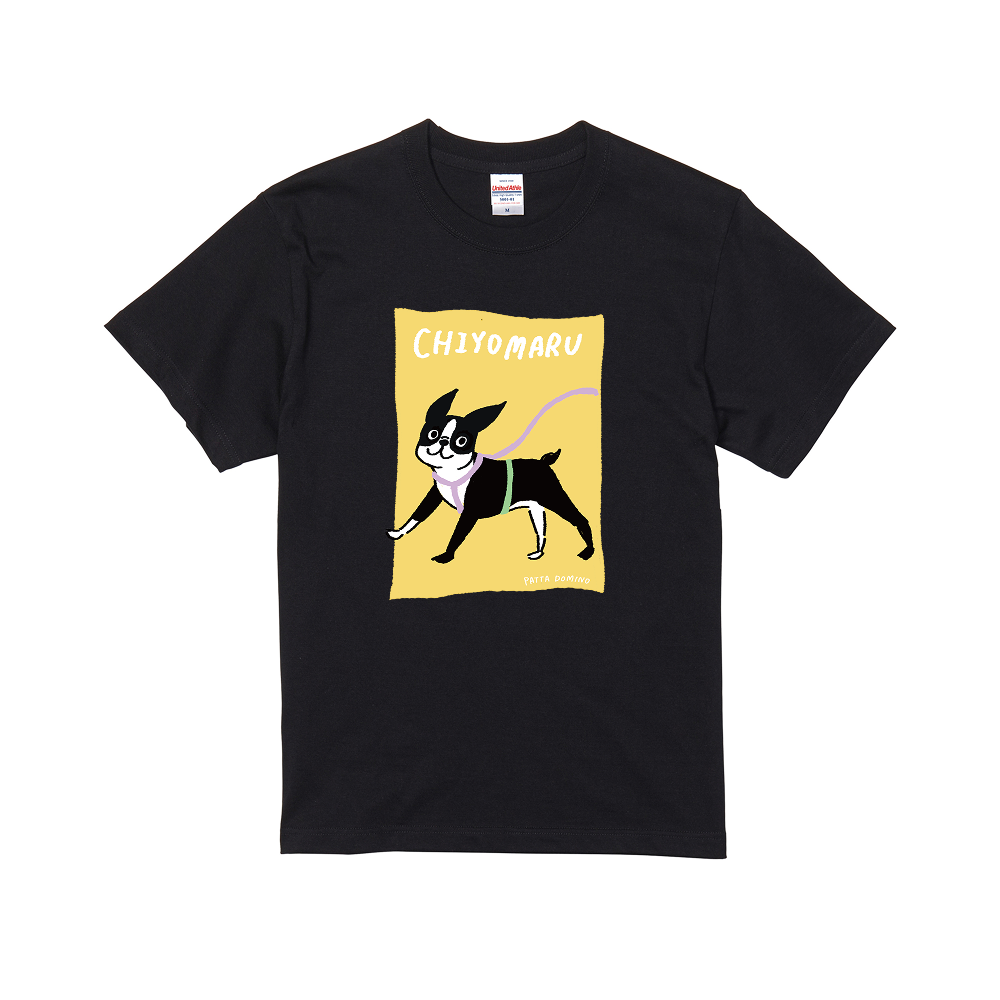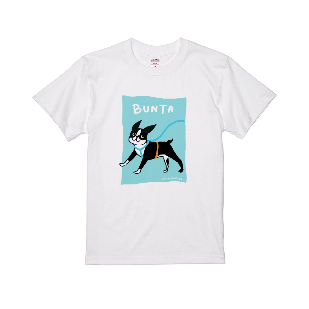 PATTA DOMINO オリジナルのボストンテリアTシャツ。お散歩にウキウキ、飼い主さんをチラチラ。