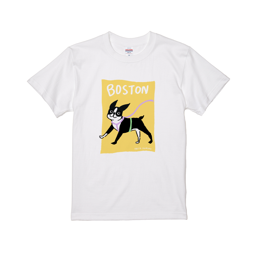 PATTA DOMINO オリジナルのボストンテリアTシャツ。お散歩にウキウキ、飼い主さんをチラチラ。