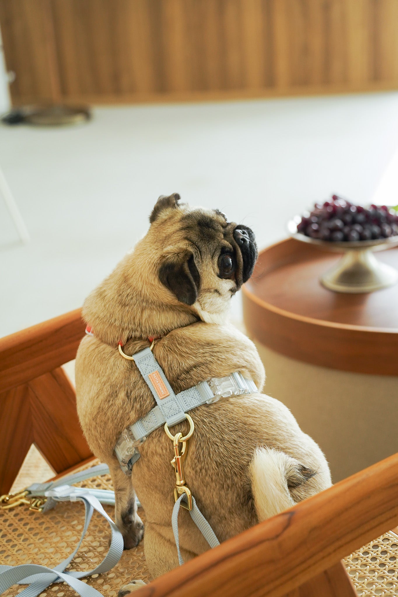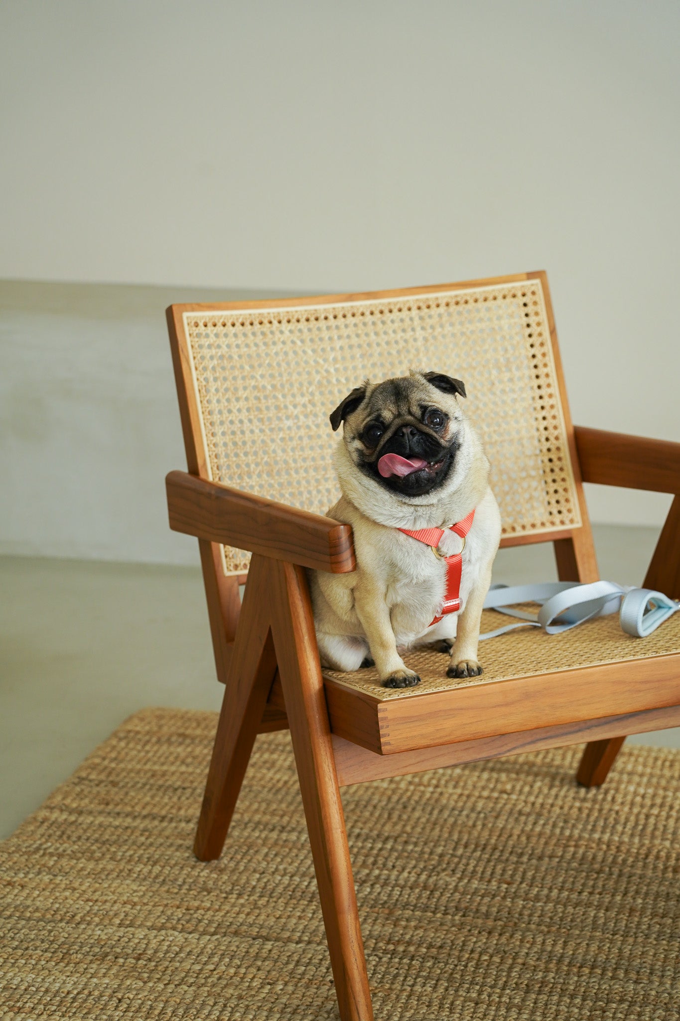 PATTA DOMINOのオリジナルハーネス。ストラップでサイズ調節でワンちゃんの体にぴったりフィット。引っ張った際の圧力が均等に分散されるため体に優しい仕様になっています。