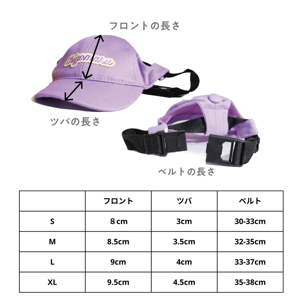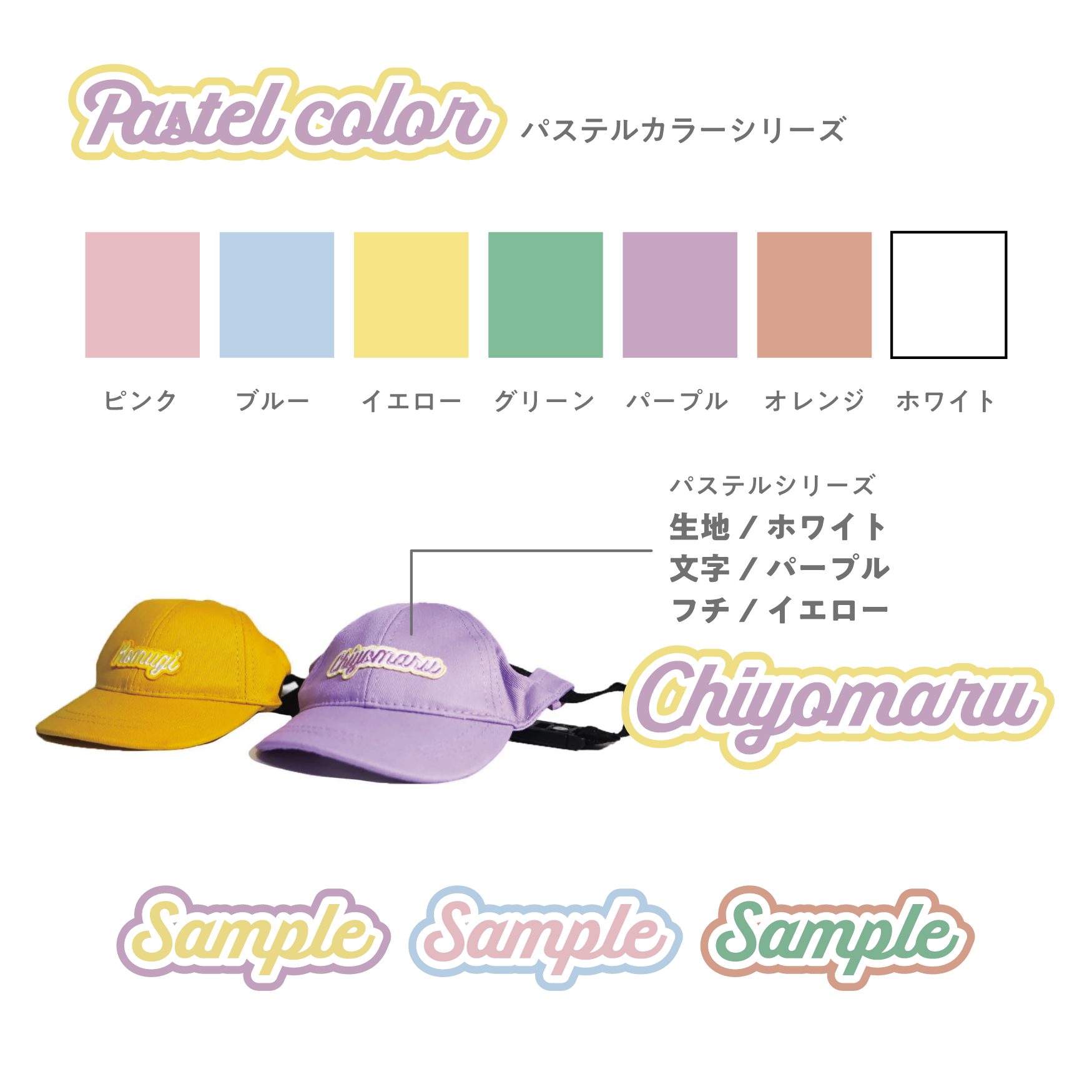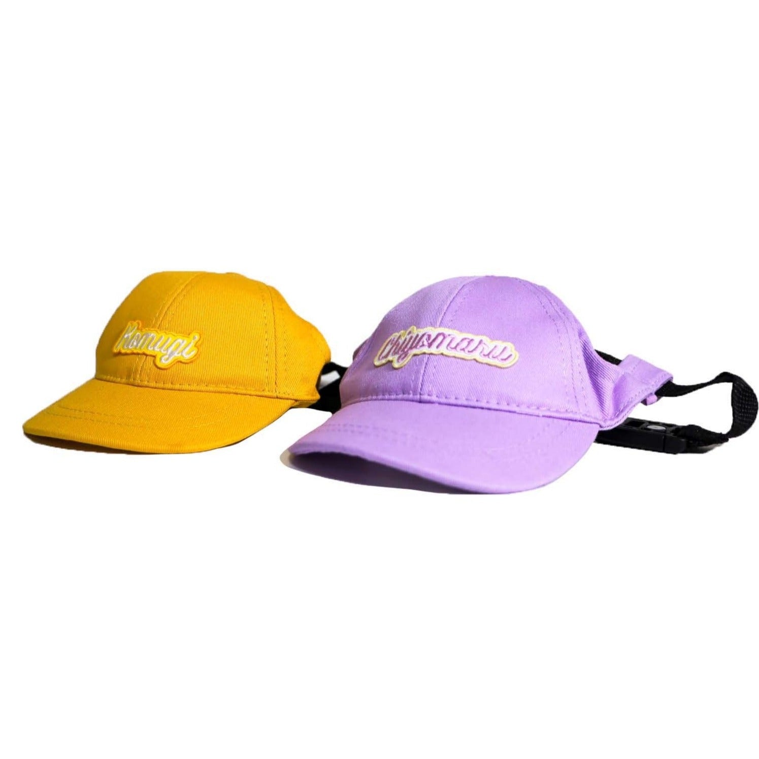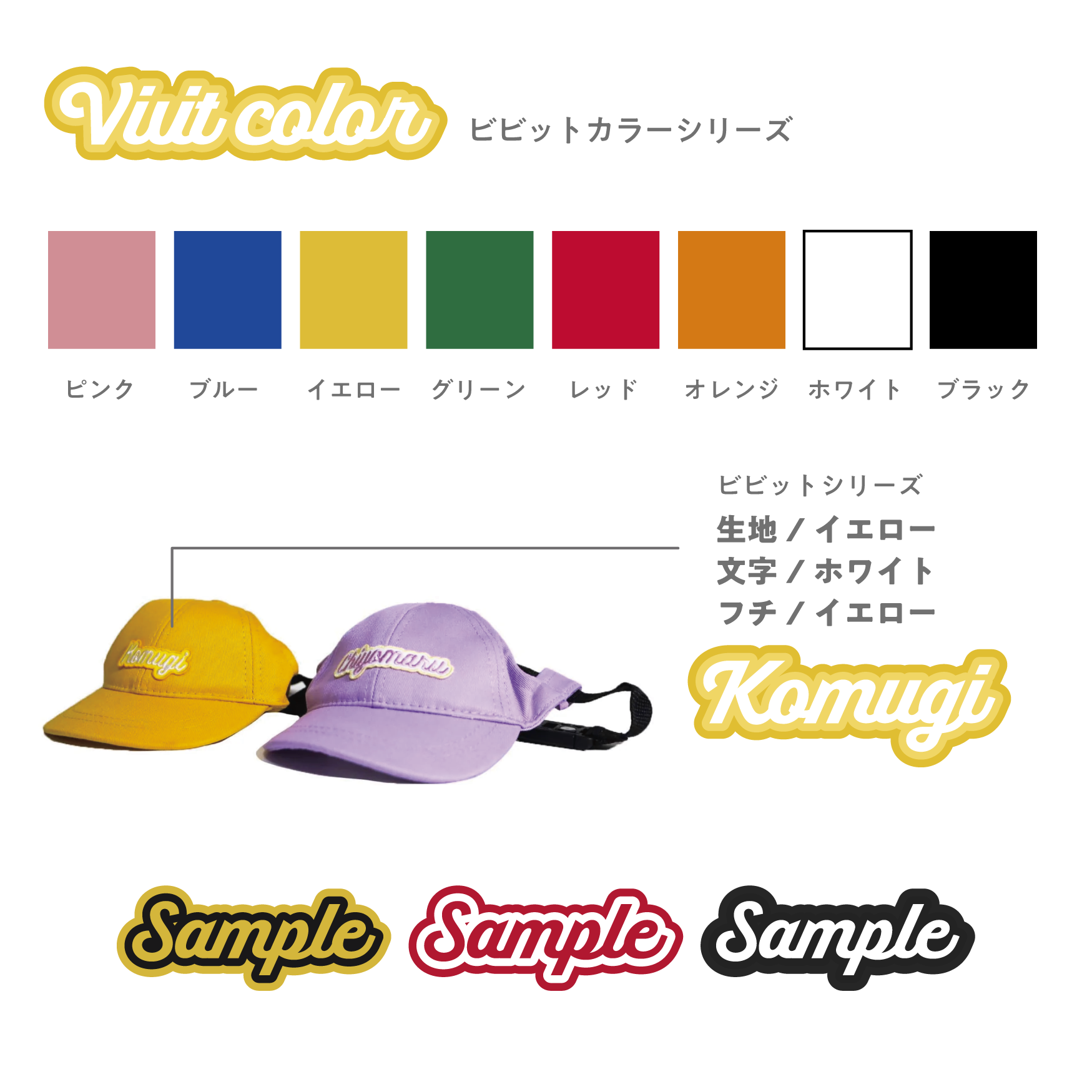 大切なワンちゃんのお名前ワッペンを取り付けたキャップです。イエローとパープルの2色展開。ワッペンもバリュエーション多数です。