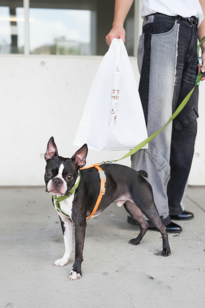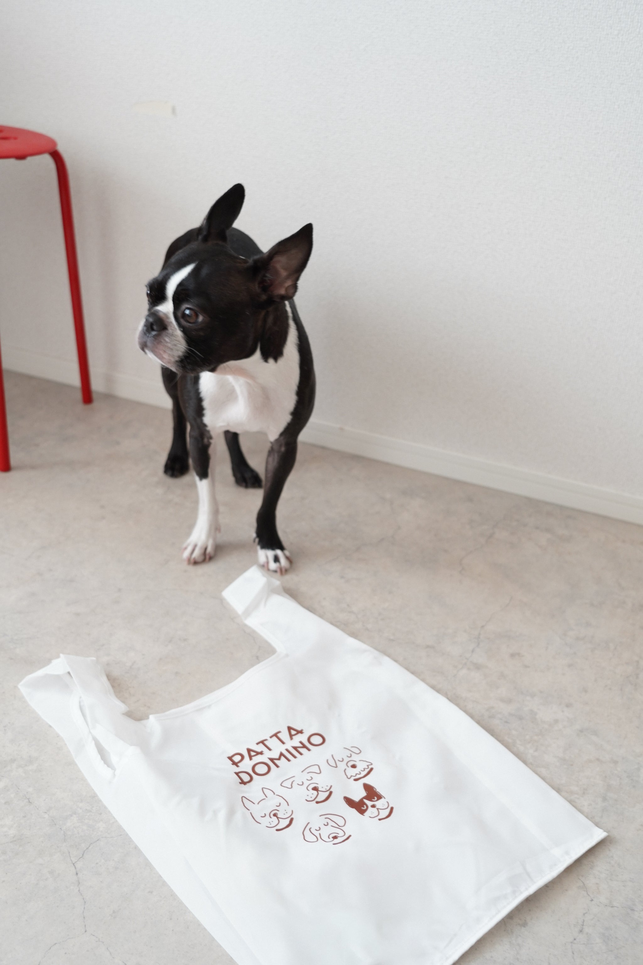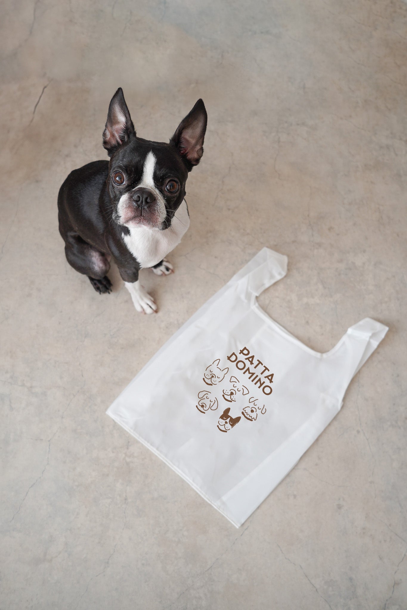 フレンチブルドッグ・ジャックラッセルテリア・シュナウザー・ビーグル・ボストンテリアの愛らしい5匹がプリントされたエコバッグ。